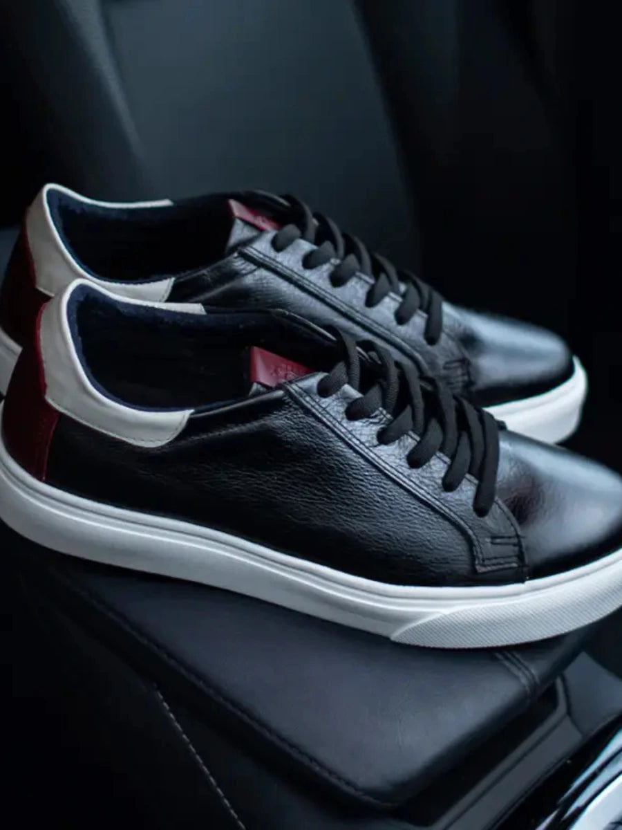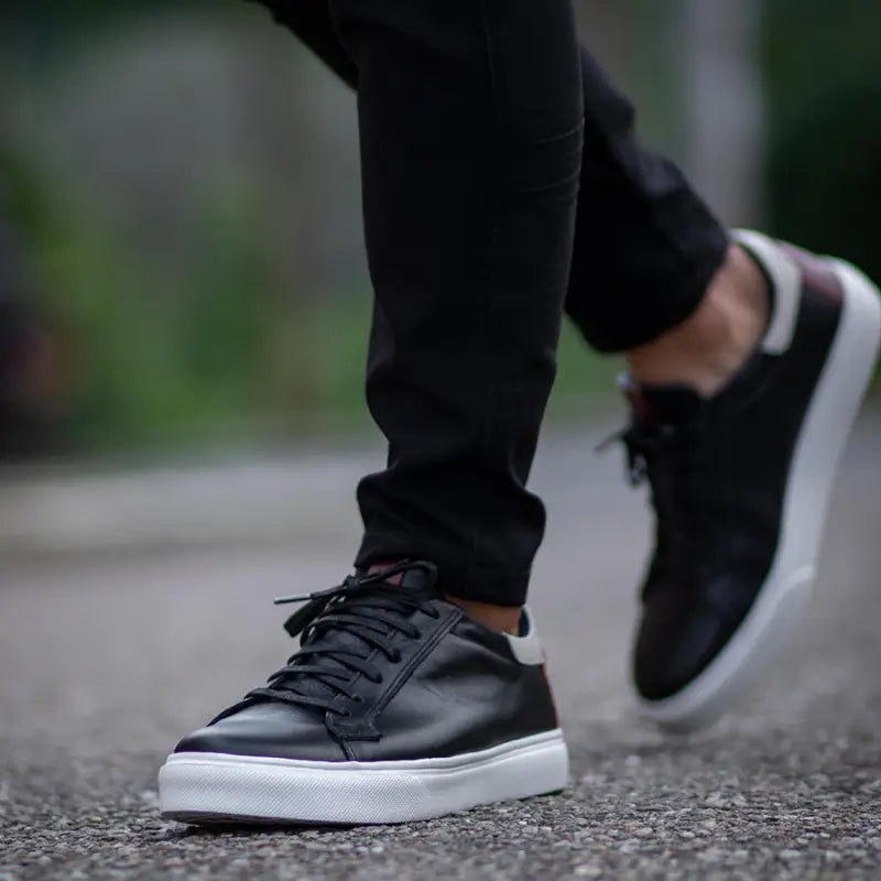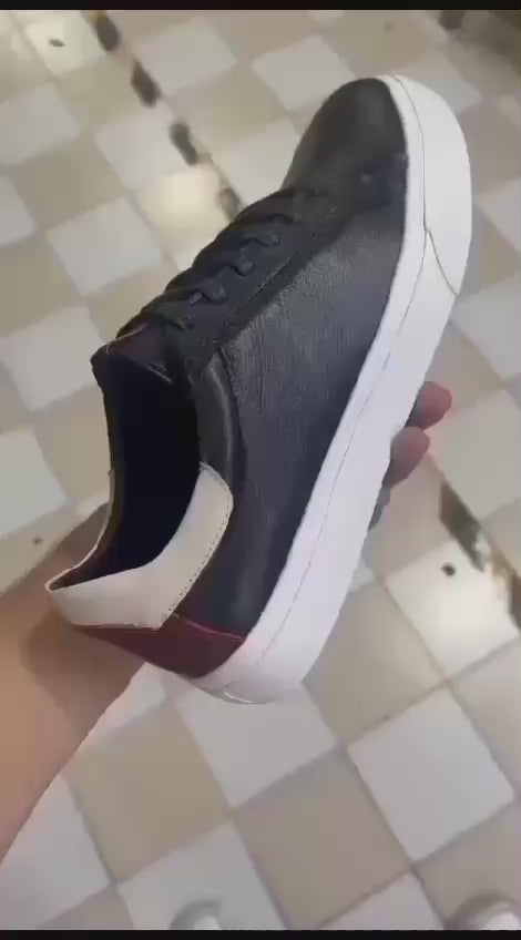 ÁMSTERDAM – NEGRO calzado enteramente hecho en cuero liso con pequeños vivos en la zona del cuello de color blanco y talón en color Vinotinto su suela Eva de color blanco que da un cierre a todo el calzado elevando su mezcla de colores