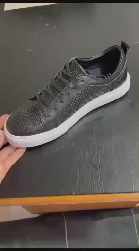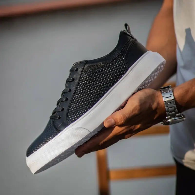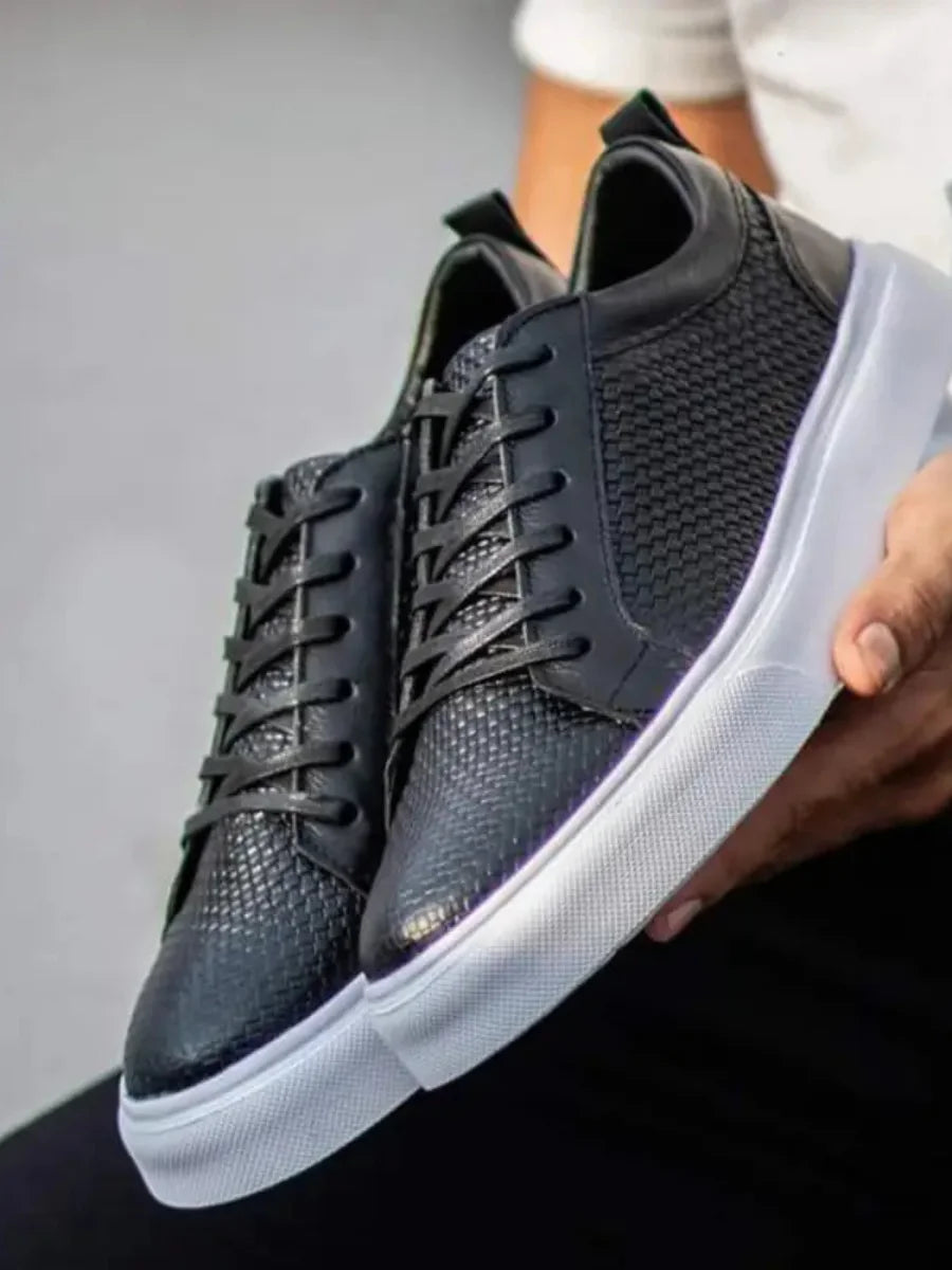 DALLAS – NEGRO calzado negro realizado casi en su completo por un grabado tipo cuadros, sus cordones encerados y suela en Eva blanca pero recta para un clásico masculino juvenil