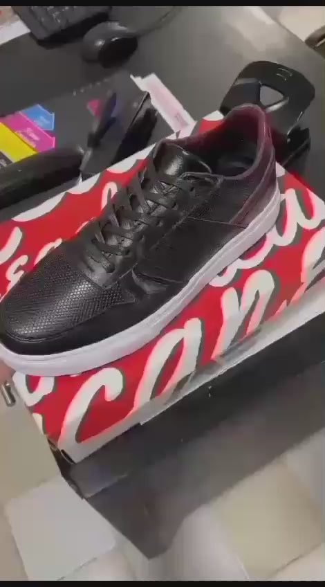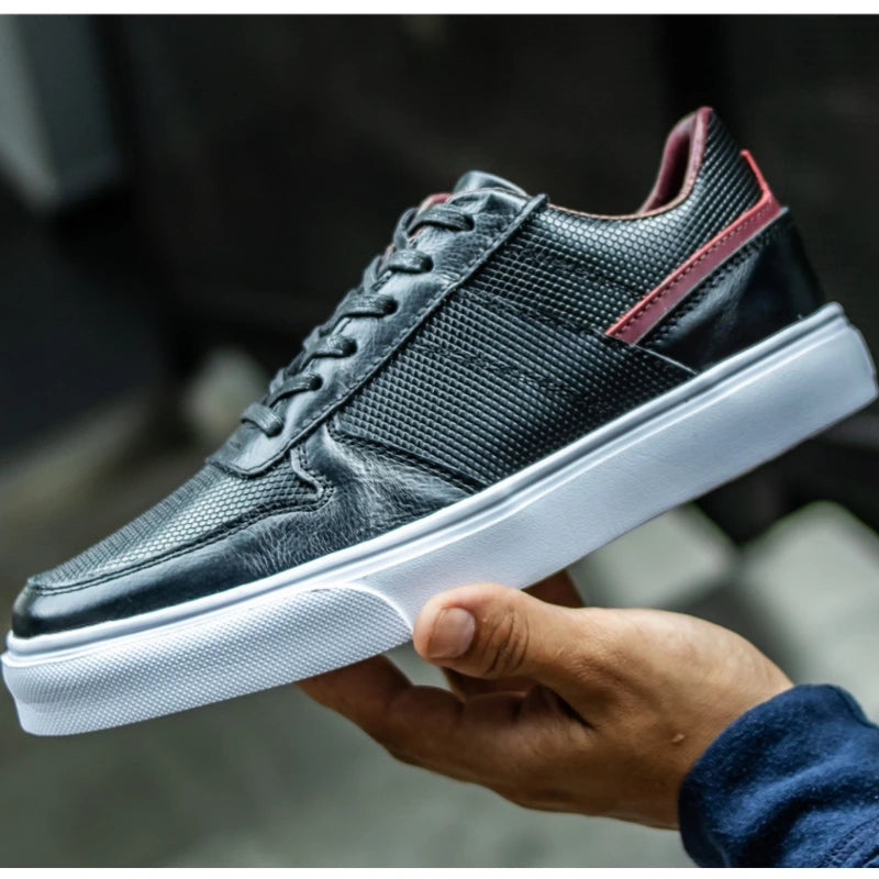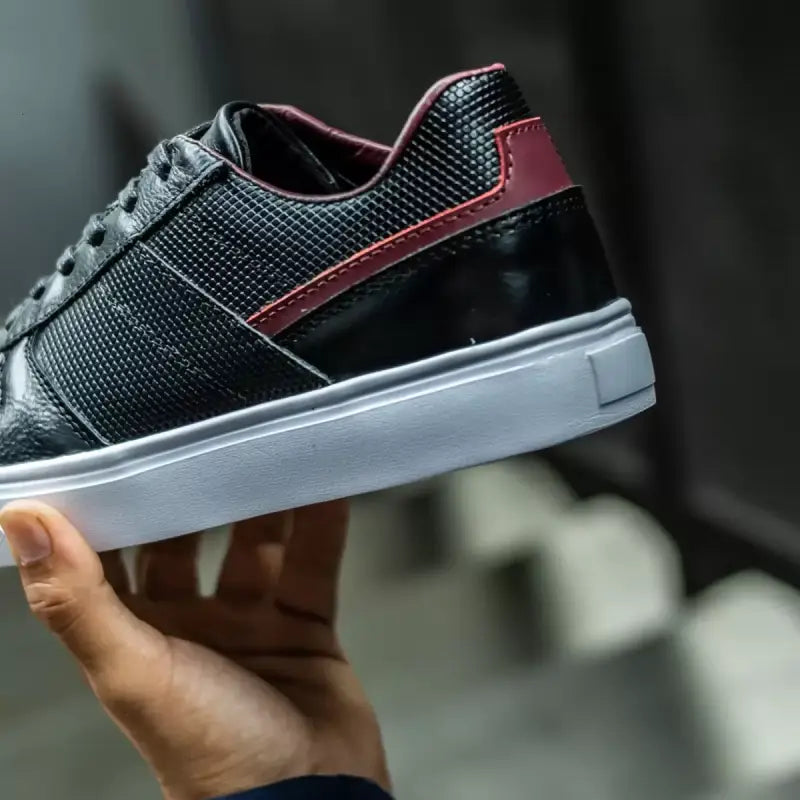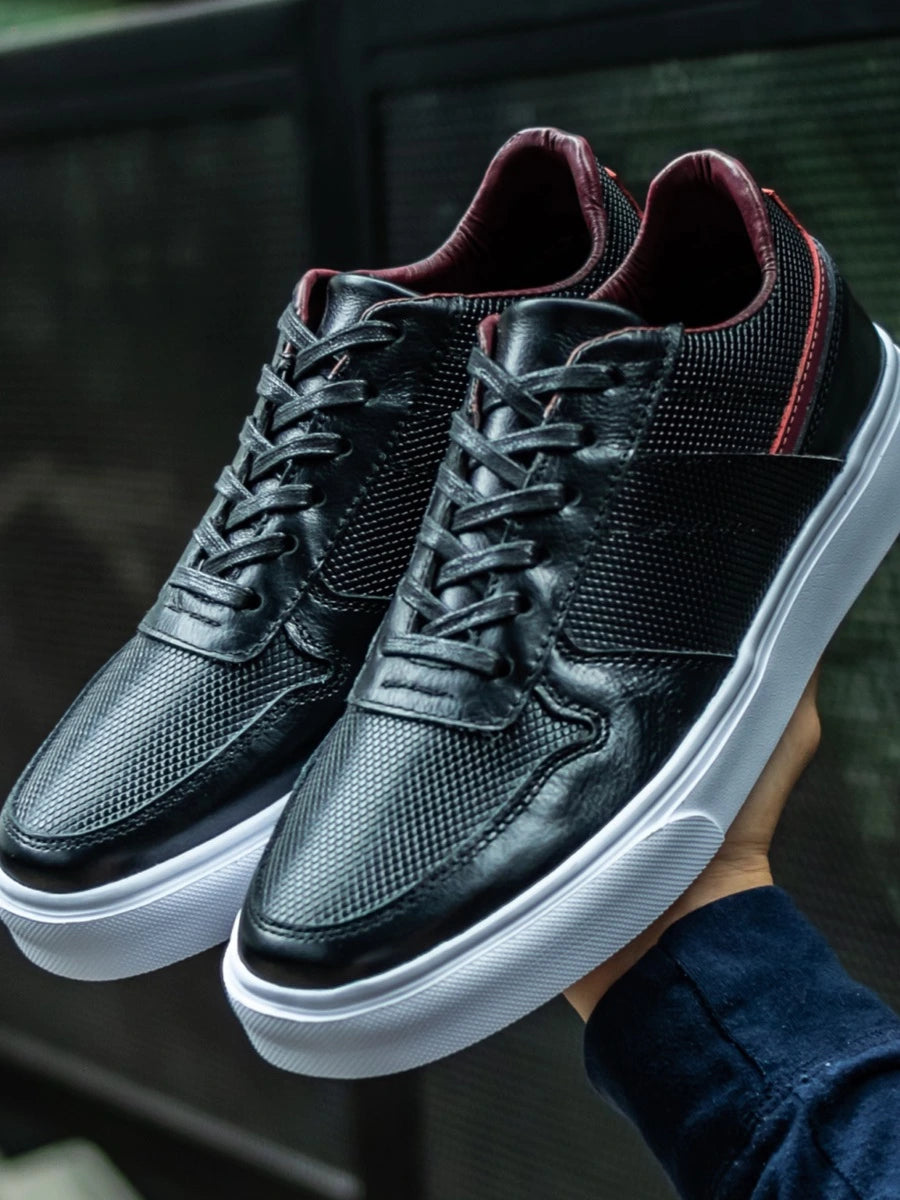 PRAGA calzado fabricado completamente en cuero negro con grabado en casi todo el calzado con un pequeño vivo en color vino tintos para su realce, lo que lo hace ver juvenil pero siempre presentable a cualquier ocasión