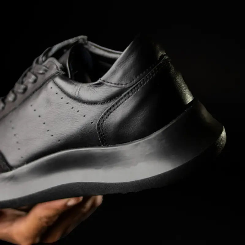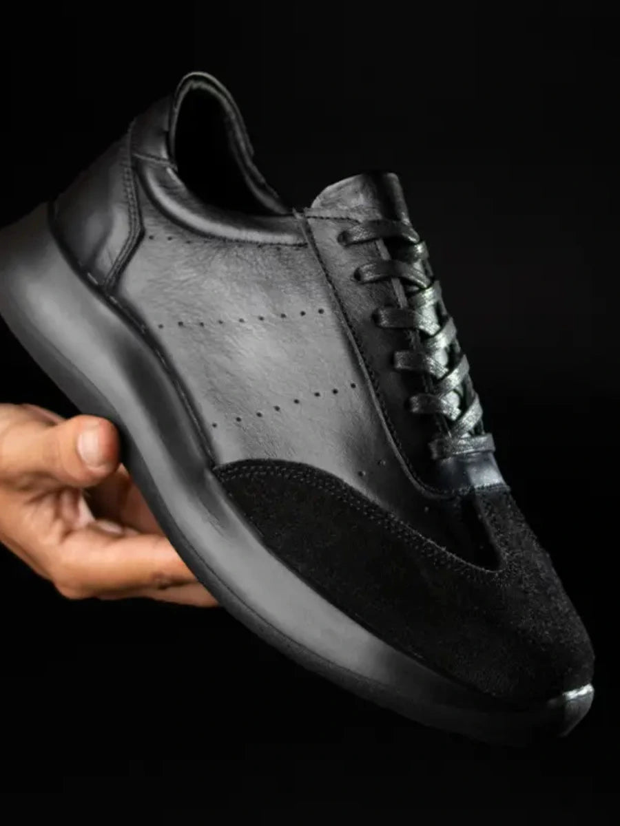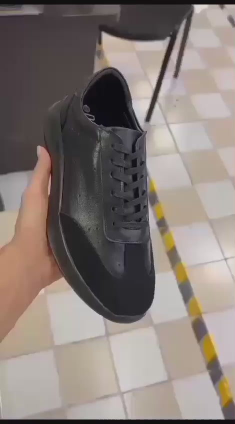 TEXAS – NEGRO calzado fabricado con una mezcla de materiales entre cuero liso negro y gamuza los dos en colores negros suela baja pero en color negro para el resaltar su combinación de materiales